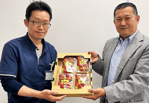 都農町でいちご農家を営む村田哲さん(中町)がコロナ禍で町民のために尽力してくれている都農町国民健康保険病院の従事者に110パックほどのいちごを寄贈。これまでも毎年同病院へ寄贈を行っており、従事者への感謝を伝えられました。