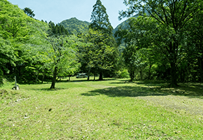 「尾鈴キャンプ場」まで都農駅から車で30分。たくさんの緑に囲まれ、いきいきと流れる名貫川など自然豊かな景色が広がります。