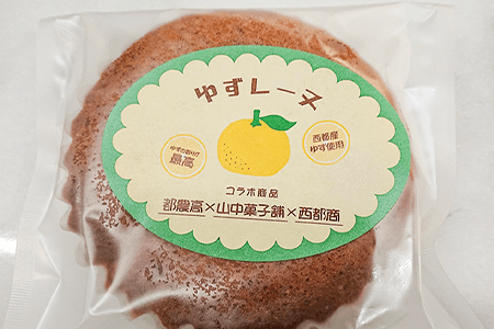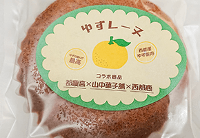 西都商業高校、都農高校、山中菓子舗のコラボ商品。お菓子を西都商業高校、パッケージデザインを都農高校の生徒が考えてくれました。西都産の柚子を使ったしっとり甘酸っぱいマドレーヌです。