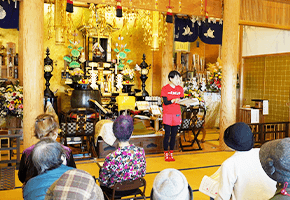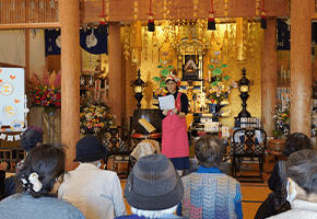 その後、副住職・吉田憲史さんから龍雲寺についての説明が行われ、住職・吉田憲由さんからは、「生き生きと生きていける話し」をテーマとし、「ご縁」と感謝の大切さが語られました。