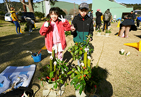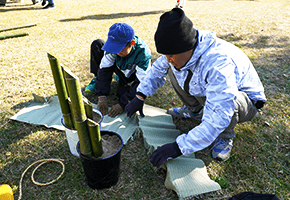 藤見公園にて、家族で門松づくりを体験するイベント「さん・さん 門松」が開催されました。今回は13組の約50名が参加。はじめに田中真幸先生から門松の由来と作り方の説明があり、その後、一家族につき門松一門ずつを協力して作り上げました。竹を切ったり飾りを差して見た目のバランスを整えたりと、苦戦しながらも各々楽しみながら作業をしました。