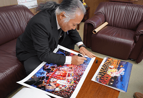 綾さんが、大きくプリントされた写真にサインを書き、カレンダーと共に坂田町長へ贈呈。その後、撮影当時の話などを交えながら談笑しました。「これからも都農町を撮っていきたいと考えています。」との綾さんの言葉に、坂田町長は「とても素晴らしい写真です。ぜひまた都農にお越しください。」と応えました。