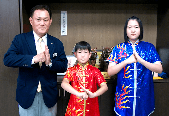 叶翔さんは4月20日、21日に開催されたJOCジュニアオリンピック武術太極拳大会に出場し、男子初級長拳の部で全国2位となりました。その他の種目でも上位入賞を果たし、見事な成績を収めています。坂田町長は「本当にすごい。今後もきょうだい2人、切磋琢磨しながら頑張ってください。」と激励し、叶翔さんは「将来は世界1位になって、コーチとして武術太極拳を教えていきたいです。」と話しました。