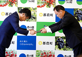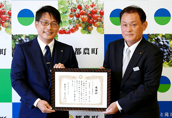 シフトプラス株式会社への企業版ふるさと納税寄付の感謝状贈呈式を行いました。いただいた寄付は、町民の健康増進のために広く利用できる施設に役立ててほしいとの意向により、旧都農高校南側グラウンドの天然芝整備に活用されます。代表取締役の中尾裕也さんはあいさつで「多くの町民の方々が利用される施設を作っていただければと思います。」と述べました。グラウンドは共用施設として、令和7年6月から利用開始予定です。