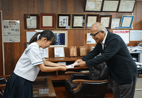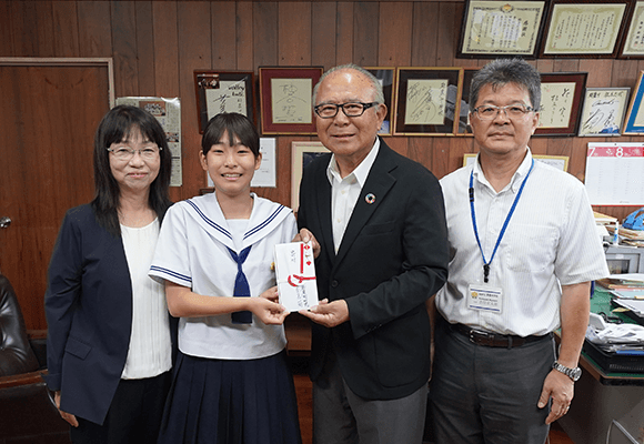 贈呈式は都農中学校で行われ、都農町親善チャリティーゴルフ顧問の吉川廣幸さんから、生徒会長の河野優希さん(駅前)へ寄付金が手渡されました。たくさんの子どもたちのために役立ててほしいとの想いから、町内の子どもたちが集まる都農中学校へ定期的に寄付をされています。今回の寄付額は20万円です。吉住校長は「本当にありがたいです。子どもたちのために有効活用させていただきます。」と話しました。