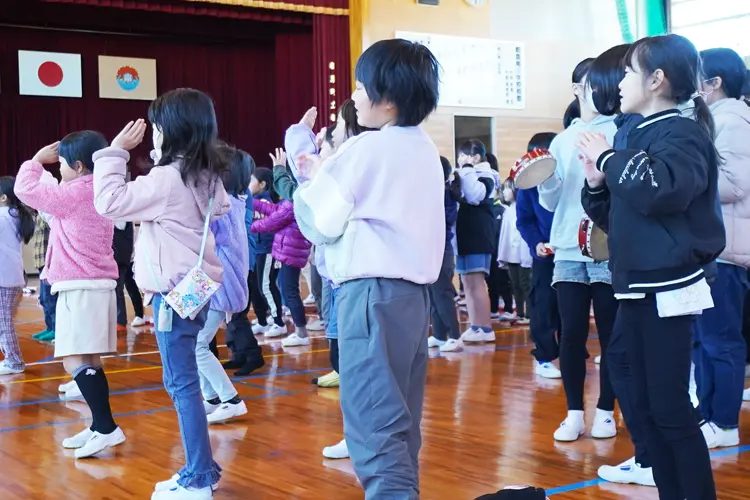隊員2名はサンタの装いをして児童への交通安全や元気なあいさつを呼びかけ、隊員のハーモニカ演奏に合わせて児童が「ふるさと」や「お正月」を合唱。児童たちは、隊員へお礼として「赤鼻のトナカイ」を歌い踊りながら楽器を演奏しました。