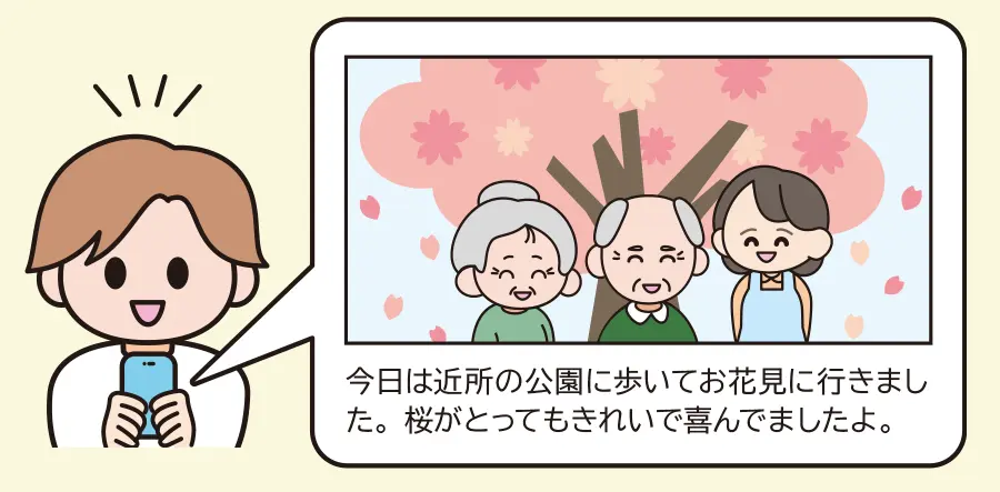 介護事業所がご本人と花見に行った際に、写真や情報を共有すると、ご家族から「楽しそうな顔が見れて嬉しい。」との声をいただきました。
