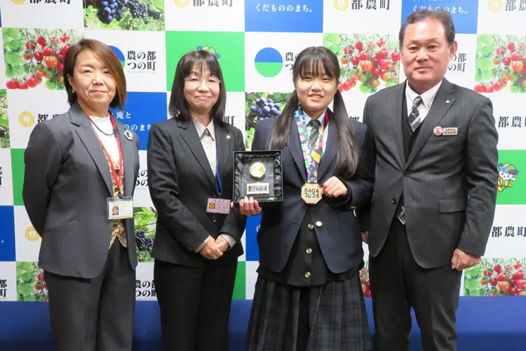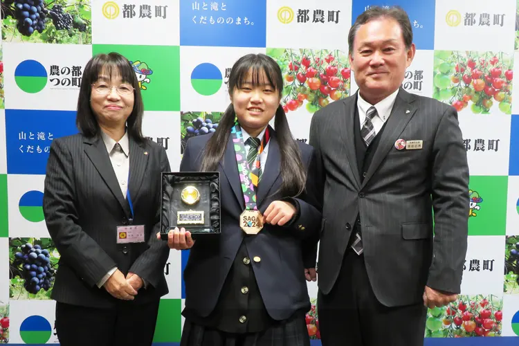 第23回全国障害者スポーツ大会「SAGA2024大会」の陸上競技50m走で優勝し、宮崎県の学生栄誉賞を受賞した児湯るぴなす支援学校高等部2年の黒木紅葉さんが都農町役場を表敬訪問しました。