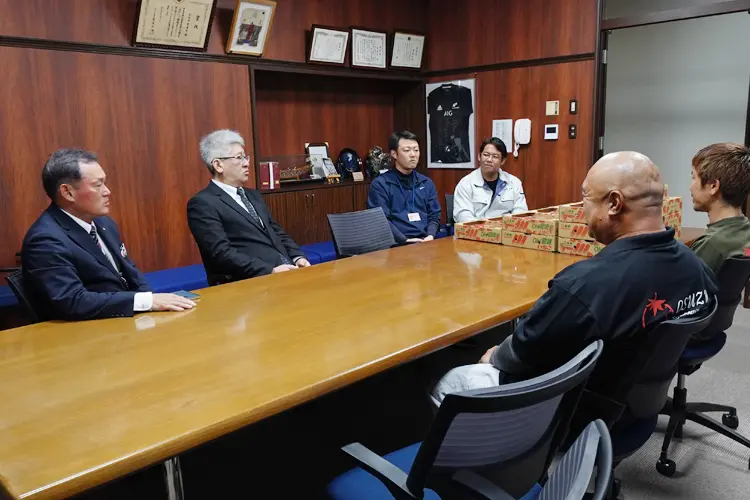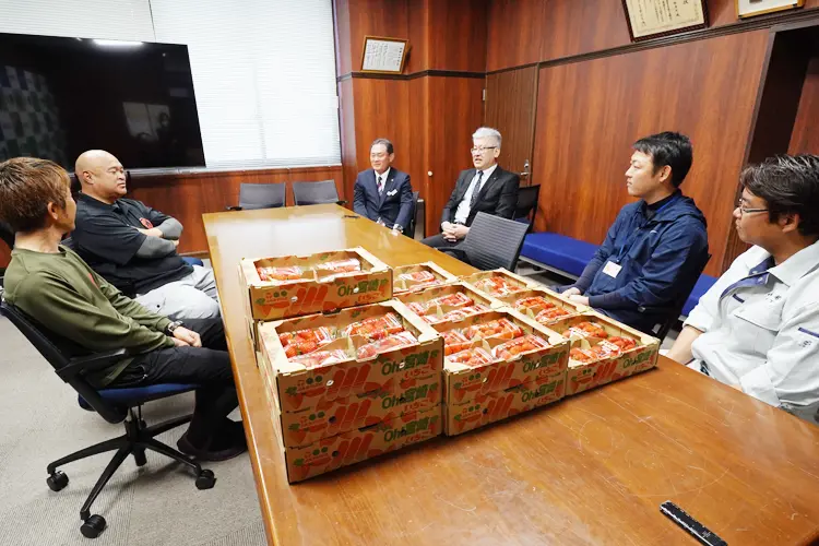 いちご76パックが寄贈され、町内の保育施設6園に配布されました。竹下政一郎副部会長は、「今日はひな祭りなので子どもたちに喜んでもらえればと思います。地産地消についても学んでくれると嬉しいです。」と話しました。坂田町長は「子どもたちが楽しみにしているので毎年いただけてありがたいです。これからも美味しいいちごを作ってください。」とお礼の言葉を伝えました。