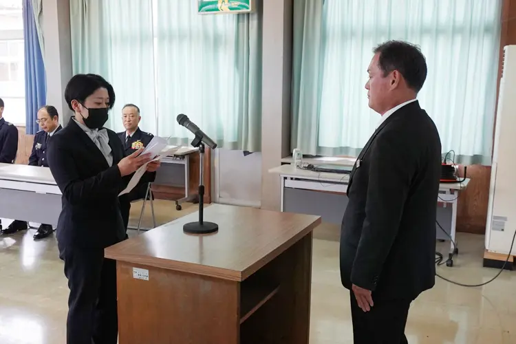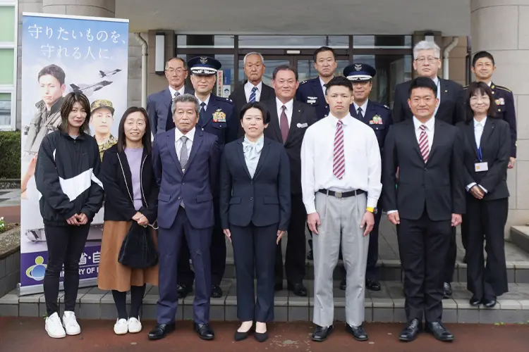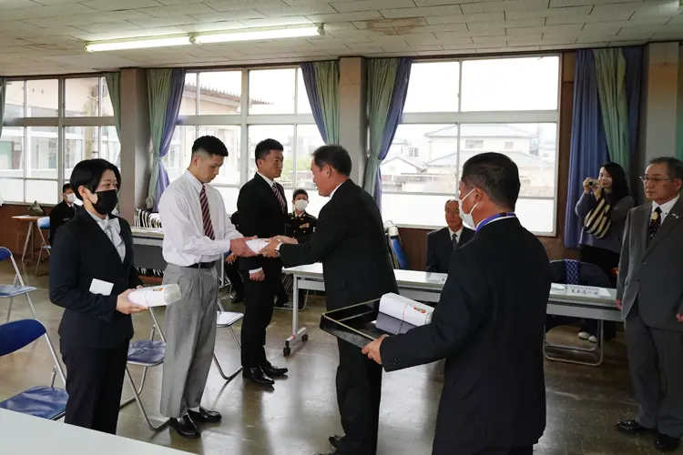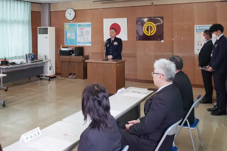 都農町中央公民館で開催され、自衛隊に入隊される3名と関係者らが出席しました。新田原基地の大嶋善勝司令は「国民の生命と財産を守る自衛隊に入隊される皆さんに、敬意を表します。訓練は厳しいですが、困ったときは仲間に声をかけてください。」と祝辞を述べられました。
