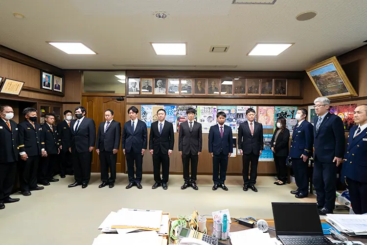 都農町役場町長室にて、はじめに前年度各部長の退任辞令式が行われ、7名へ2年間の活動への感謝の意が伝えられるとともに、感謝状と記念品が贈られました。続いて新たに選任された部長7名、副部長7名への辞令が交付されました。坂田町長は「消防団員はコミュニケーションが大事になります。皆さんが団結し、一生懸命務めていただけることを期待しています。」と話しました。新たに東分団第4部の部長となった黒木孝宏さんは、これからの防災活動に向けて「現場では迅速に、全員が機械を動かせるように訓練を重ねて備えていけたらと思います。」と話しました。