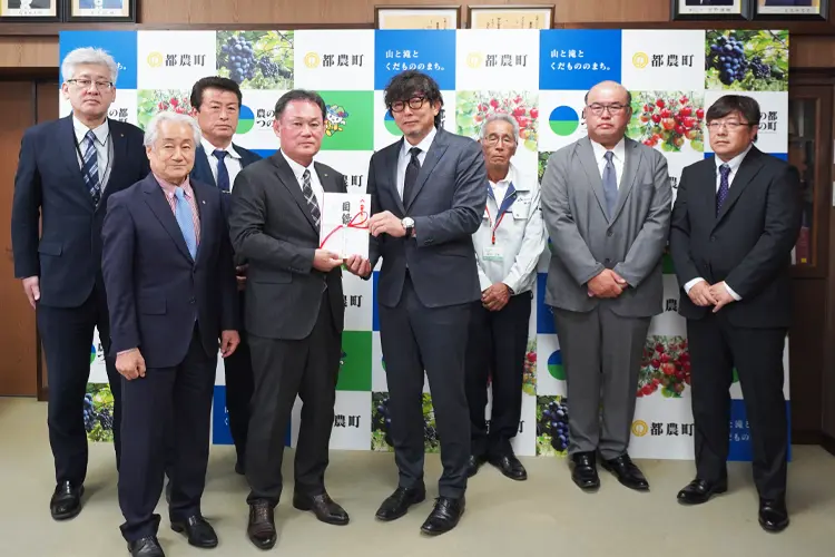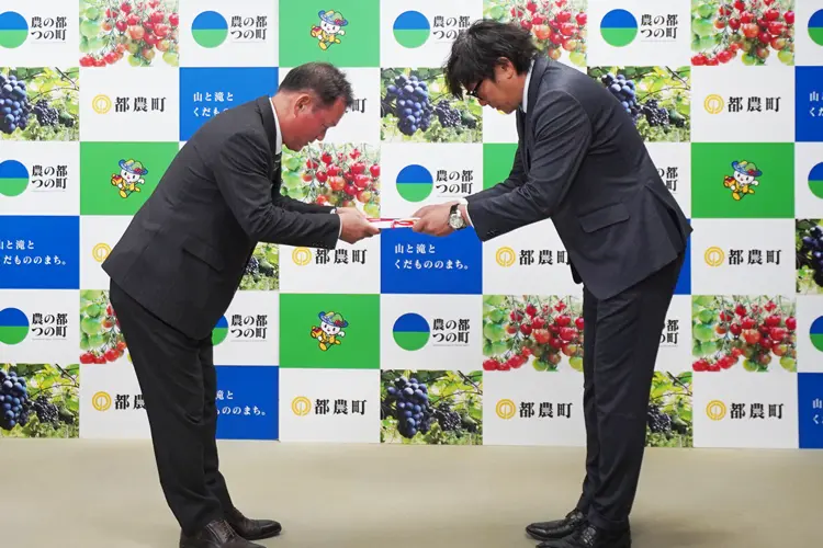 道の駅「つの」を運営する株式会社都農まちおこし屋から都農町へ、500万円の寄付金が贈呈されました。令和6年6月から株式会社都農まちおこし屋の代表取締役社長として就任された青山一さんは、「都農町のためになるように使っていただければと思っております。」と話しました。坂田町長は「道の駅は都農町の観光の玄関口として、多くの方に親しまれています。これもひとえに、まちおこし屋の皆さまのご尽力のたまものだと感じております。」と話しました。寄付金は商工業振興対策基金に積み立てられ、様々な商工業支援事業で活用される予定です。これまでの寄付金額は累計1億6,000万円となります。