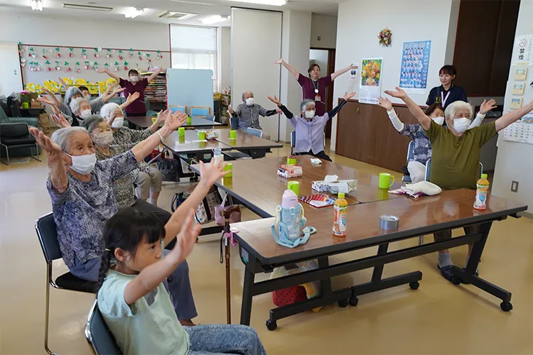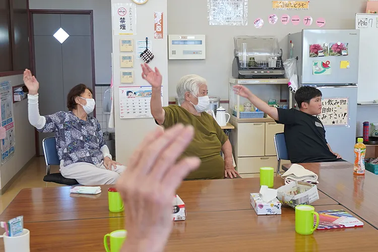 利用者の皆さんへお茶を配ったり、施設内の清掃、ご自宅へ戻られる利用者さんのお見送りなどをボランティアとして体験しました。