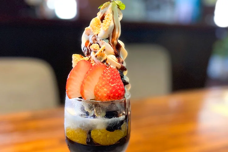 創業47年、老若男女から愛されるレトロな雰囲気の喫茶店。ボリューム満点のメニューが特に人気。おすすめは、アツアツの鉄板で提供する「ハンバーグステーキ」と、人気No.1のソフトクリームがのった「コーヒーゼリー」。