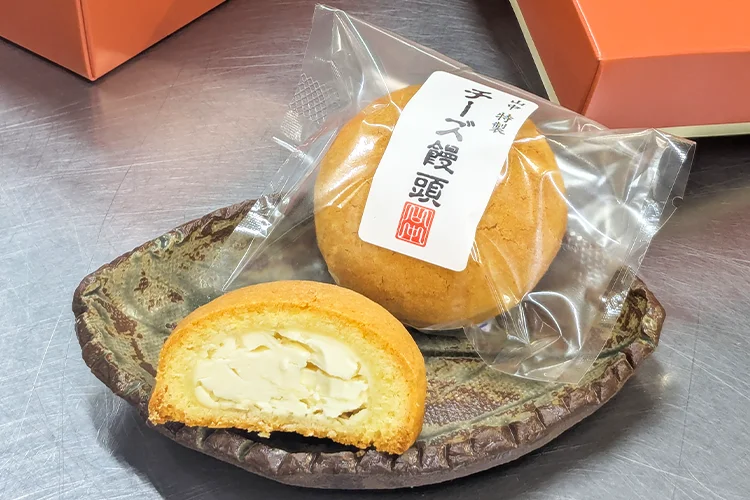創業75年、”お客様の「大切な日」をお手伝いします”をモットーに、地元食材を使った商品や、オリジナリティあふれるお菓子を販売。おすすめの「チーズ饅頭」は、たっぷりチーズにアーモンドを練り込んだ生地のアクセントがクセになる!