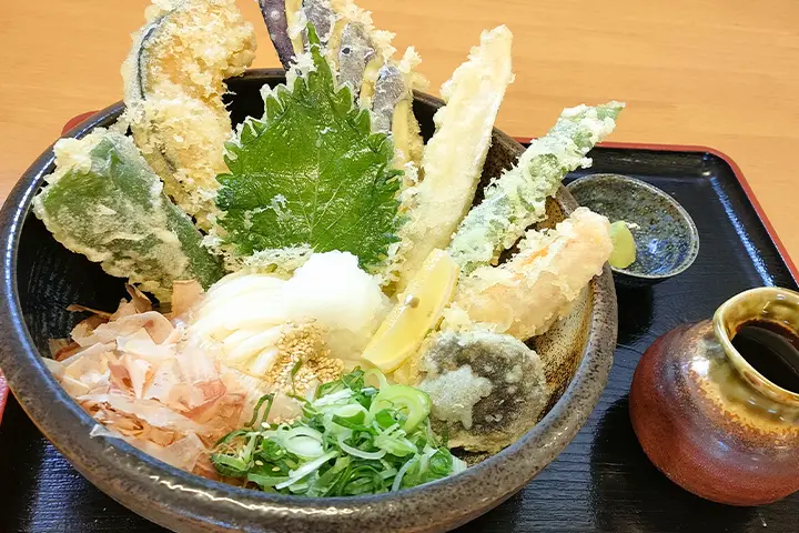 地元産の野菜を使った揚げたて天ぷらと、2日間手間暇かけて作る打ちたて・茹でたてにこだわった自家製うどん、出汁マイスター渾身のつゆとスープ。三位一体のうどんをお楽しみいただけます。