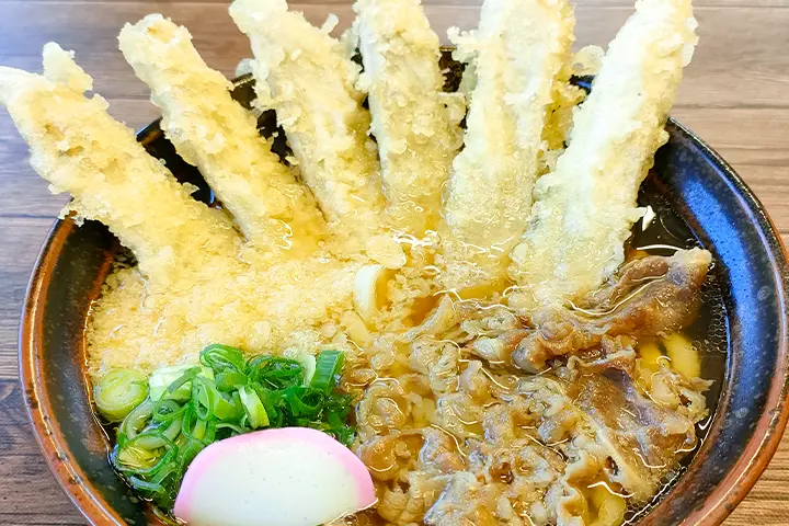 牛肉の甘みと北海道産昆布の旨みが合わさったスープに、揚げたてサクサクのゴボウ天をトッピングした定番人気メニュー。