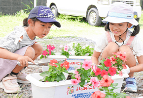 小学生を対象に「花いっぱいになーれ」ボランティア体験が行われました。この活動は花を見た町民の方が元気になって欲しい、そして子どもたちがボランティアを続けるきっかけになって欲しいという想いが込められています。当日は三鍋種苗店の協力のもと、ニチニチソウやポーチュラカなど200株以上が用意され、子どもたちはボランティア連絡協議会の会員と協力し、夢中になってプランターに花を植えました。植えた花々は役場や道の駅「つの」などに贈呈されました。