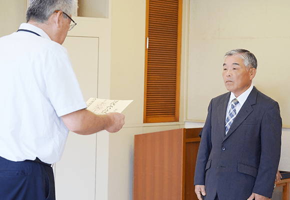 今年7月に逝去された、元消防団長の荒川哲男さん(北新町)の生前の功績を称えて叙位伝達式が都農町役場にて行われました。荒川さんは56年間消防団員として精練し、16年間団長を務められました。この日の伝達式には次男の荒川秀樹さん(松原)が出席し、瀬尾副町長より叙位が手渡されました。伝達を受けて秀樹さんは「父にとって消防団活動は生きがいのようなものでした。亡き父もきっと喜んでいると思います。以前にいただいた叙勲と共に墓前へ供えたいと思います。」と話しました。
