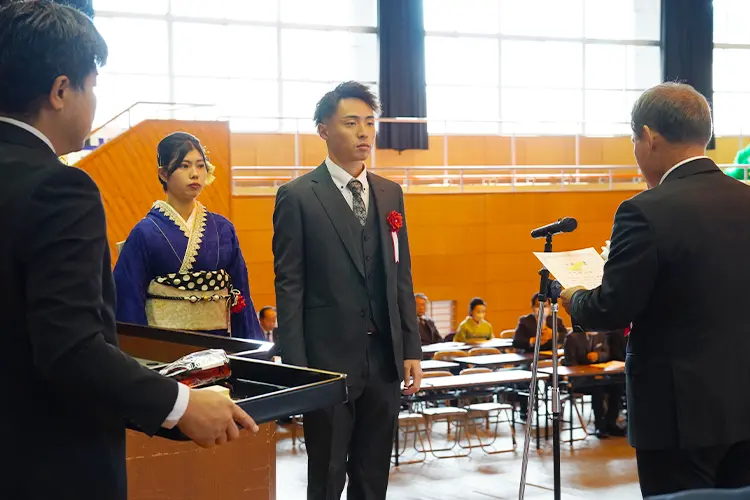 式典では、国歌斉唱、町民憲章唱和に続き、二十歳証書の授与と記念品の贈呈が行われ、二十歳代表謝辞は黒木大地さんが務めました。