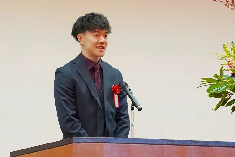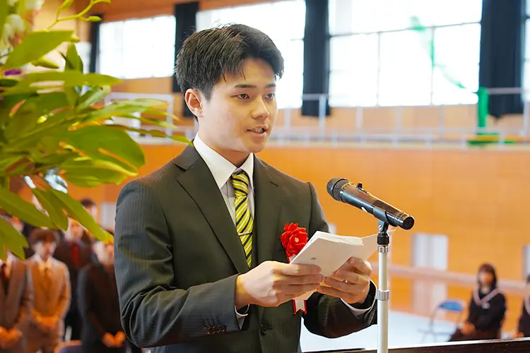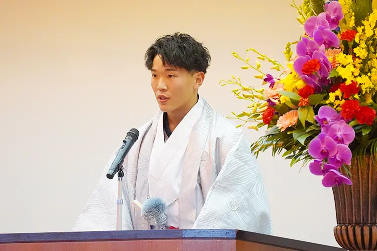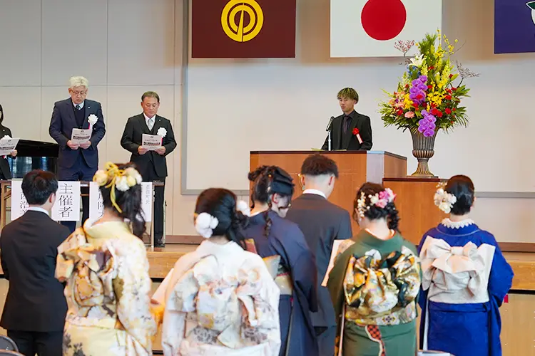 心身ともに健やかに成長され、二十歳を迎えられましたことを心よりお祝い申し上げます。既に社会人として活躍されている方、学業に励んでいる方など様々ですが、いずれも社会の一員としての責任を担っていくことになります。人口減少や災害など課題はありますが、命と平和の尊さを胸に、民主主義の担い手として、ふるさとへの誇りを持ち、夢に向かって挑戦されることを期待し、式辞といたします。