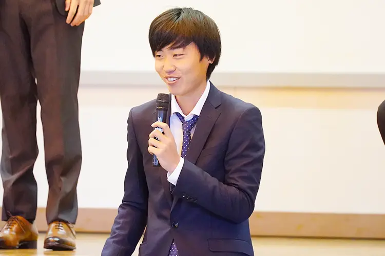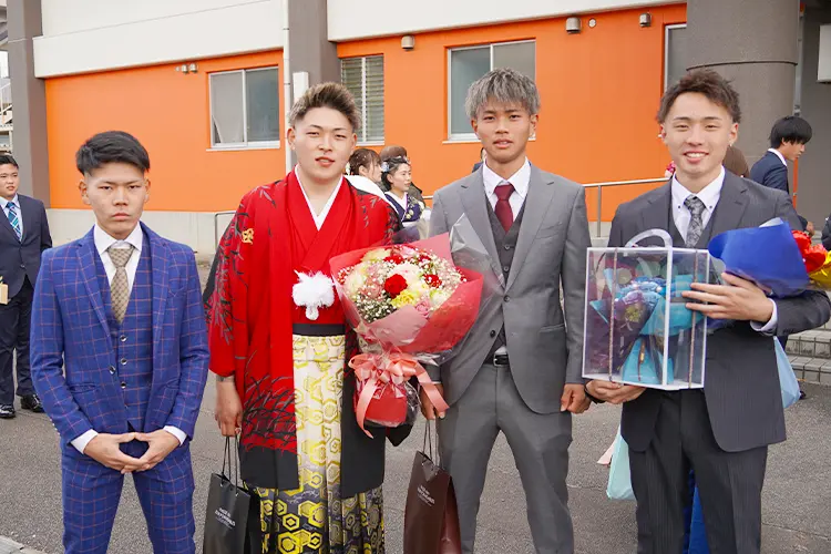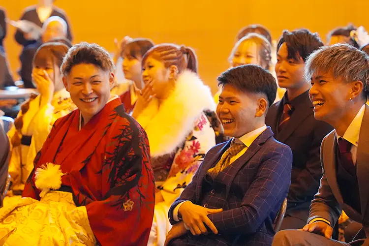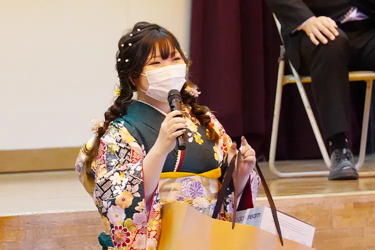 第二部では、実行委員による催しが行われました。学生時代の恩師からのビデオメッセージが上映され、昔を懐かしみ笑顔が広がりました。また、中学校時代の先生が実際に来場し、お祝いの言葉を述べました。その後、抽選会が和気あいあいと行われ、意見発表では、門田和浩さんと黒木一臣さんが登壇し、それぞれの将来の夢や思いを語りました。