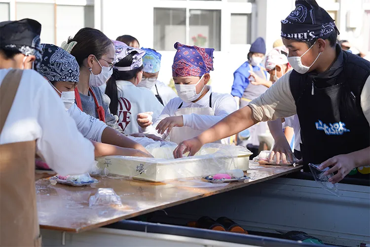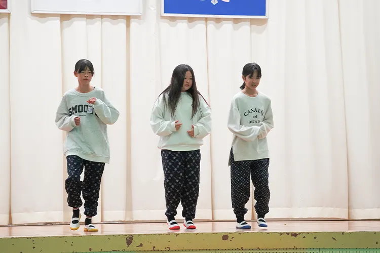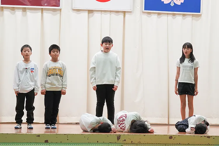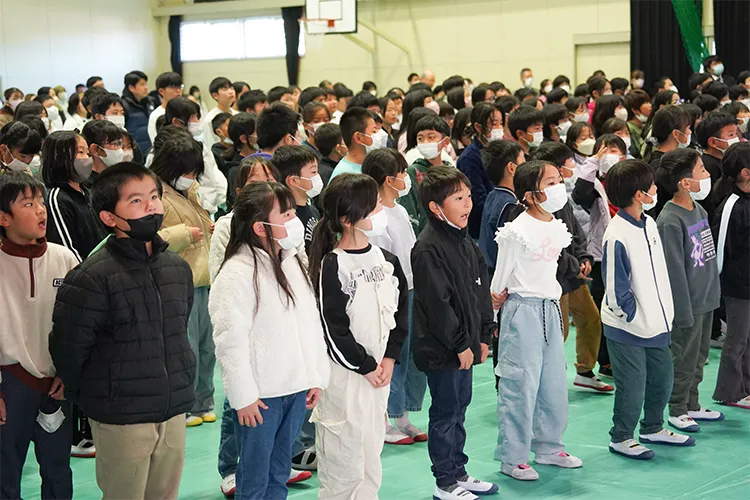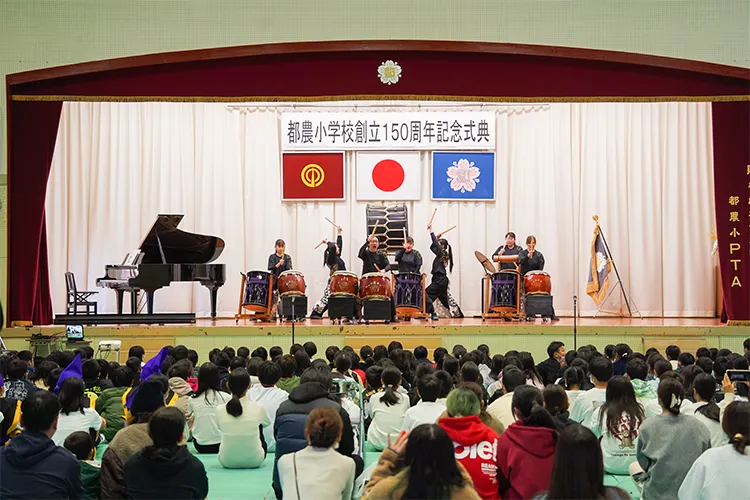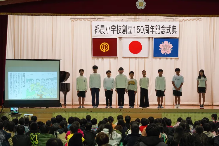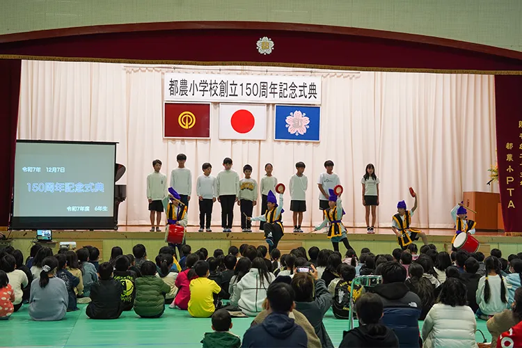 都農小学校が令和7年11月19日に創立150周年を迎えたことを記念し、12月7日に記念式典とおすずっ子祭りが開催されました。式典では、オープニングで「都農青年太鼓・新瀧(あらたき)」の演奏や児童2名と「しゃくなげコーラス」「enjoyコーラス」による国歌斉唱などが行われました。その後は6年生による「都農小150年の全力一心」と題した発表が行われ、都農小の歴史を振り返るとともに、戦時中に殉職された三先生を偲ぶ会が行われました。式典後にはおすずっ子祭りが行われ、児童たちは餅つきを楽しみ、会場はにぎわいました。